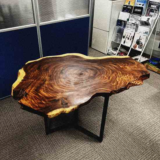 企業様の商談スペースへ納品させていただいた、 特別仕様のモンキーポッド輪切りテーブルをご紹介します。 一般的な輪切りテーブルとは一線を画す、 中心から外側へ広がる波紋状の幻想的な杢目が最大の魅力。 自然が長い年月をかけて生み出した模様は、 まさに一点物のアートです。