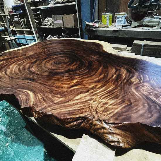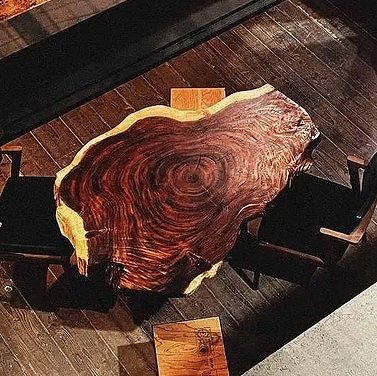 輪切りテーブルは、 単なる家具ではなく 空間の印象を決める象徴的存在。 今回の一枚は、 波紋のような杢目と モンキーポッド特有の色合いが融合した 特別仕様のテーブルです。