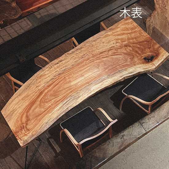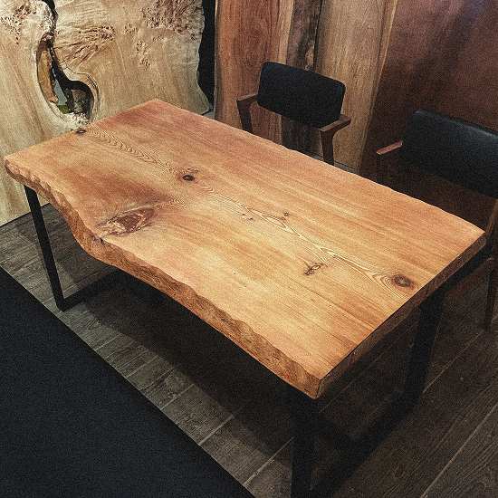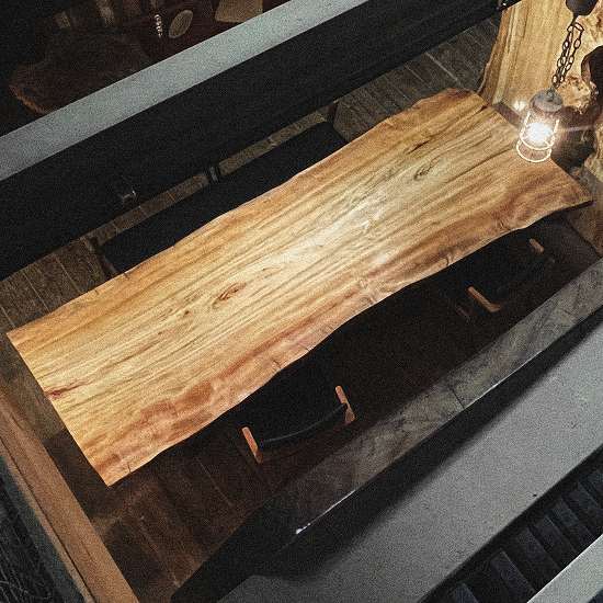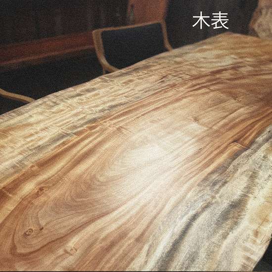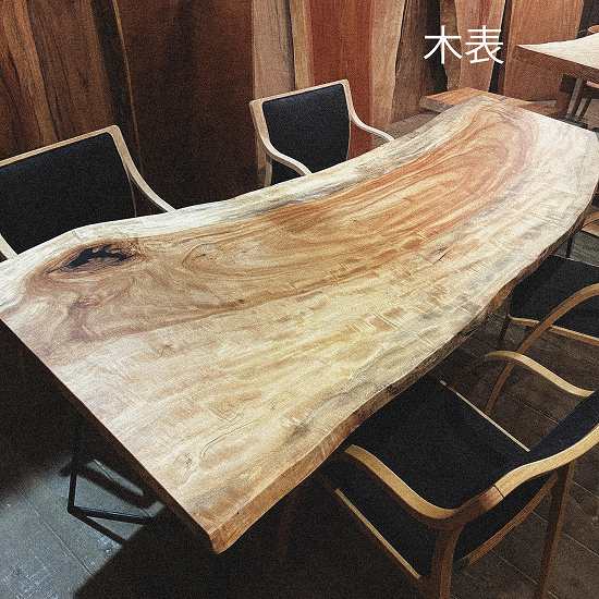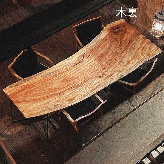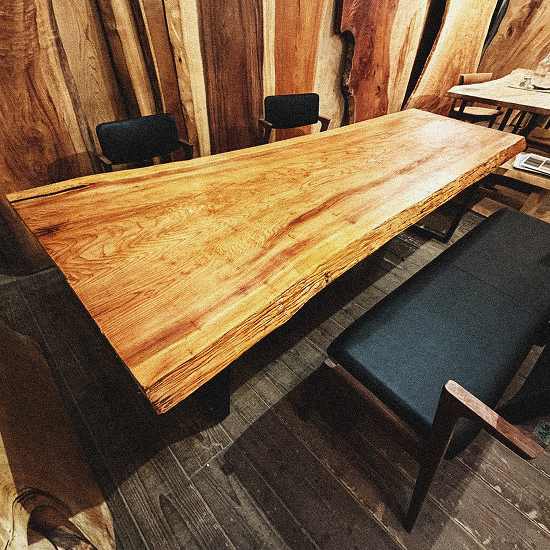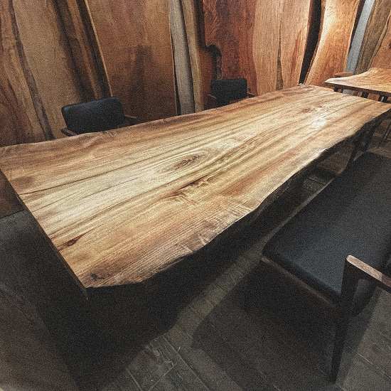 特徴的な縞模様が美しいこの一枚板は、8人でのお食事を楽しむには最適です。その迫力の厚さは7㎝オーバー、存在感溢れるダイニングテーブルとして