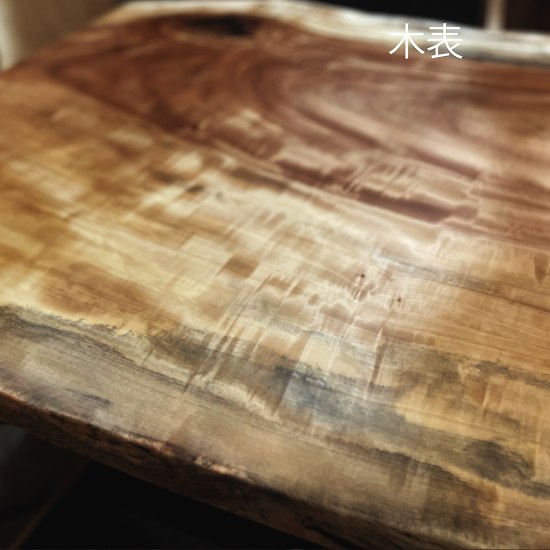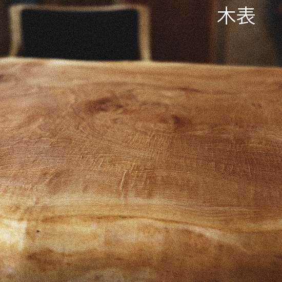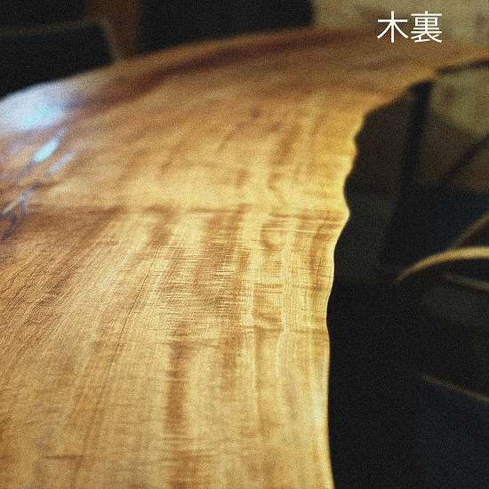 贅沢な縮杢入りが特徴。希少価値の高い一枚板は、その美しい木目と暖かみが魅力です。